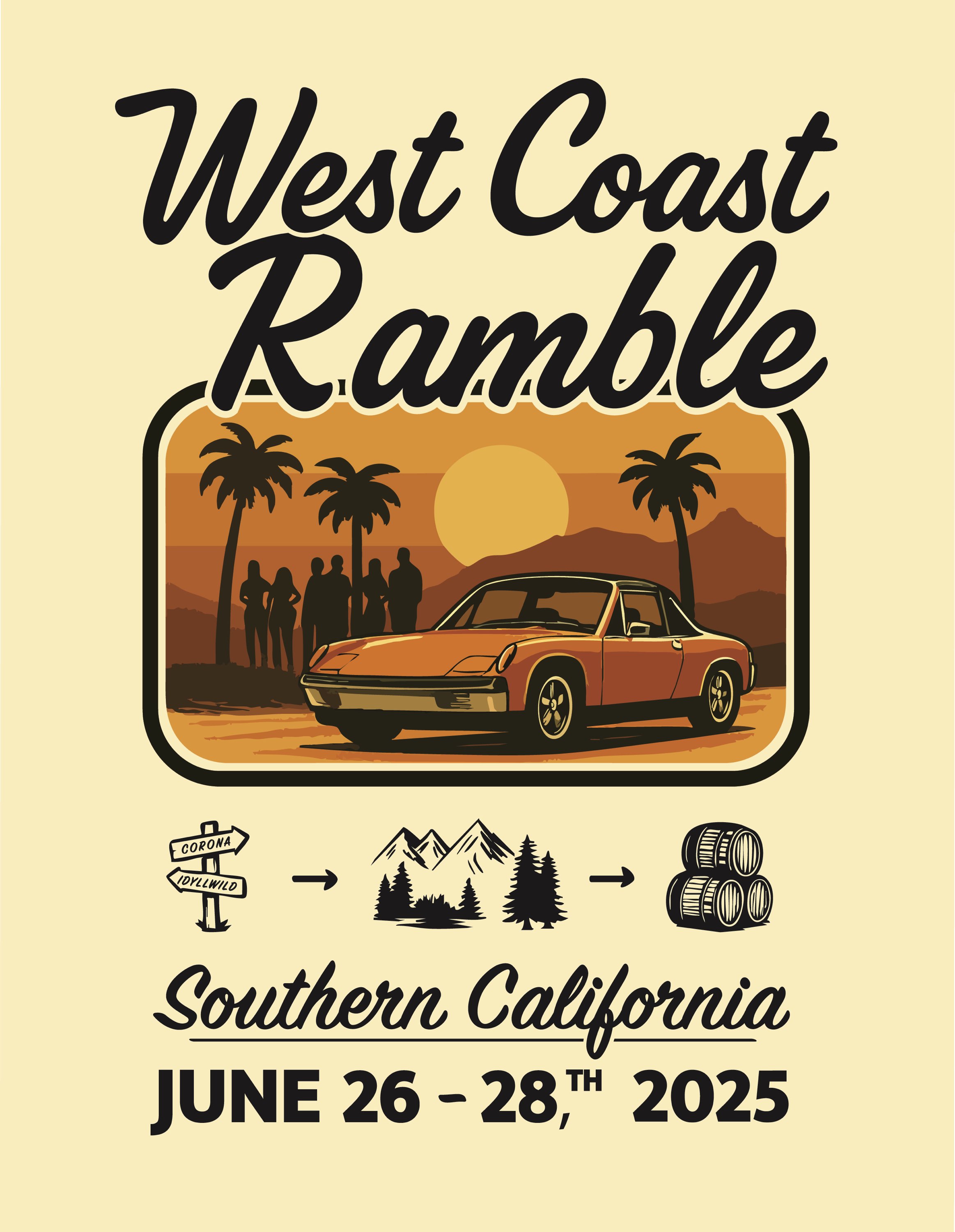 Click here to see what you missed. https://dropevent.com/WCR2025/slideshow We have a picture and video uploaded. Go to http://westcoastramble.com/ You can upload still pictures and videos. You can download other peoples pictures. There are four folders. Thursday, Friday, Saturday and other. Please add a caption about the image noting your screen name and brief description of what is in the picture. The site can be used by 914 world members for uploading 914 pictures they want to share. Only post appropriate images. Do not post any pictures of people that you would not want posted of yourself. We have about 40 914's and almost 90 people attending. Some attendees are driving other Porsche models or other cars. Looks like it is shaping up to be a great event. Looking forward to seeing all of you there. 6 days and counting. Group rate has expired. Room price subject to availability Book our room ASAP if you are staying at Ayers Hotel in Corona. They sell out every weekend. Call 951-734-2140 and ask for Portia. Tell her it is for WCR 2025 Volunteers We will need help with various event activities such as car parking for group photos and for car show., stuffing goodies bags for attendees, handing out goodie bags and shirts, and more to be determined. Contact me by PM if you can help. Use this post for up to date information. Full Registration is $65 and includes Thursday and Saturday night food, tee shirt, goodie bag, raffle tickets to donations. 2nd person registration is $20 and includes the above but no tee shirt. Tee shirts will be available for purchase prior to the event. Event drives and car show will be Ayers Hotel at 2260 Griffin Way Corona, CA 92879. https://www.ayreshotels.com/ayres-hotel-corona-east Includes FREE breakfast buffet from 6:30 AM-9 AM Call 951-734-2140 to register, Ask for Portia. Thursday 26 June 4 PM - 9 PM: Registration packet pickup and get-together at Oscar's house in the La Sierra area of Riverside (10 min from Ayers Hotel). Food, appetizers, and drinks will be provided. Friday June 27 6:30-9 AM Registration packet pickup at Ayers Hotel 9:14 AM: Depart Ayers Hotel for Porsche of Ontario. 10:00-10:45 AM: Group car photo at Porsche Ontario and tour of their Porsche Classic Center.. 11:00 AM Drive to Mt Baldy summit. Group car photo shoot. 11:30 Drive to Golden Corral Buffet in Ontario for lunch. 1 PM Drive to Galleano Winery in Jurupa Valley for wine tasting and relaxation. Wine tasting, light food, and sparkling waters are available for purchase. Leave or stay at your leisure. Please drink responsibly and use a designated driver if needed. 3:30-4:00 Depart Galeano Winery on your own 4-PM Return to Avery Hotel Margie Smith-Haas - Presentation "An Afternoon with a Historic Legend" Pioneering the Legendary 24 Hrs of LeMans Margie's journey from her 1973 914 1.7 to a historic Professional Championship. For more background on Margie check out this video: Barnyard Finds Race Car Legend Margie Smith-Haas - Part 1 of 4 FYI, It is a 4 part series and each center Part is different[b] After the first 1:08 lead in segment. https://www.youtube.com/watch?v=jg8wbxqk9z4 4-5 Prep cars for car show. 5 PM-6 PM Car show and Tech Quiz Tech quiz will be to identify 20 obscure 914 or 914-6 parts. No cell phone, internet or talking to a friend access allowed. Prizes to be given for best and mist cirrect answers. 6 PM and on. Dinner on your own. A list of several near by restaurants will be listed later. [b]Saturday June 28 6:30-9 AM Registration packet pickup at Ayers Hotel and optional breakfast at Ayers Hotel. Free to guests. $10 for non guests. 9:14 AM Depart for drive to Idyllwild. 11:00 - 1:00 Enjoy the mountain air, shopping, and lunch on your own. We may have a sub sandwich lunch from Butch's Grinders. Depends on interest level. There will be an additional charge. Depart Idyllwild at your leisure. Free time until gathering at Oscar’s 4PM-9pm Gathering at Oscar’s for dinner and awards. 5:00 PM DINNER and raffle prize drawings. Currently have several donated raffle prizes including: 914 Rubber Bringing many of the parts they have made that help keep on cars on the road 914 Werke https://914werke.com/ Generously donating: Flat tow bracket Fog/Driving Light set + brackets Billet Oil temp sender plate Billet Mini sump assembly Carburetor throttle stand Side shift bronze console bushing Tow loops, pair H/L retaining ring Stainless screws Robust J-tube seals, pair https://914werke.com/ Empi Evilworks Transmission Rebuild Services - Two $500 certificates for labor on a trans rebuild. One certificate per winner Jeff Bowlsby Wire Harnesses $50 gift certificate off any product. Restoration Designs 914 Blade type fuse panel. Fuse Panel (With Cover): Restoration Design Inc. https://www.restoration-design.com/mm5/merchant.mvc? Margie Smith-Haas - Donation of one of her cool 914 pillows MSDS Headers 2.0 914 4 Cyl Performance air filter Patrick Motorsports. Porsche Ontario Porsche Riverside Unobtanium Inc More to follow as things develop. Please reply in this thread or PM me if you plan to attend. We have had great response and plan to have a great event. Registered Participants (IMG:style_emoticons/default/first.gif) 76-914 914_7T3 914-300hemi + 1 914SIXXation 914werke 914Wes bdstone914 Blue Lady campbellcj densible1 +1 Drem914 Elliot Cannon FlacaProductions Framos914 + 1 Gene gonzo54 +1 lbubba42614 + 1 jcd914 + 1 Jack Standz jim_hoyland LS1V8JERRY + 1 Luftgekuhlt914 mapguy MartyYeoman +1 Mattty900 Mowog4 + 1 mxkinn01 + 1 PVG123 Rfoulds riquemar Robarabian Ron914 + 1 Sb914 + 1 SO.O.C914er+1 Steve Steve914 +1 Strawman ValcoOscar +1 (IMG:style_emoticons/default/first.gif) (IMG:style_emoticons/default/smile.gif) Attached thumbnail(s) Attached image(s)