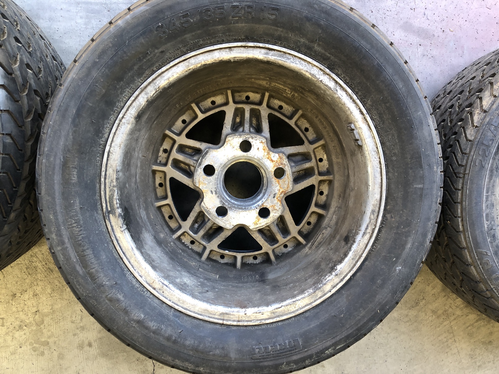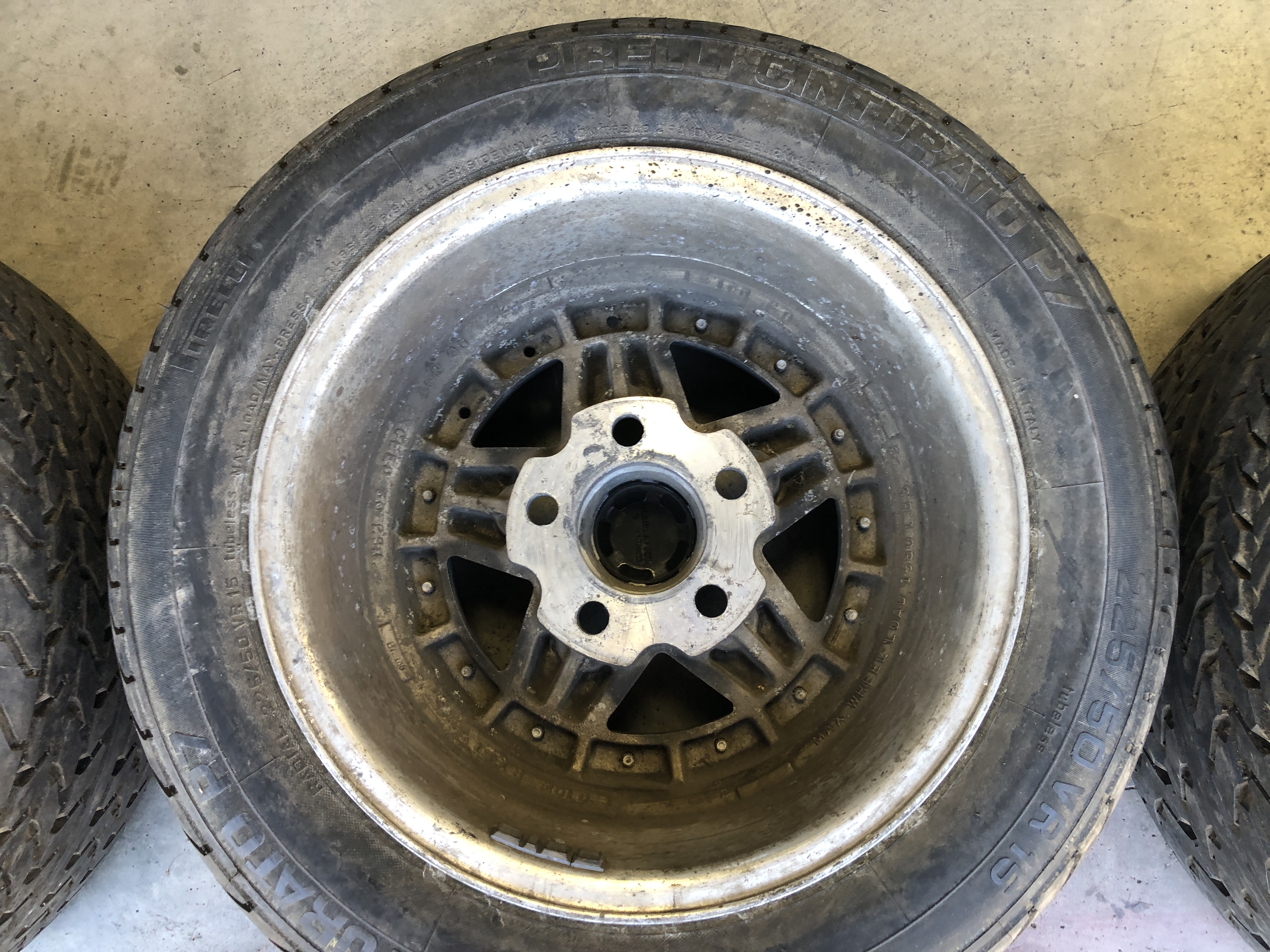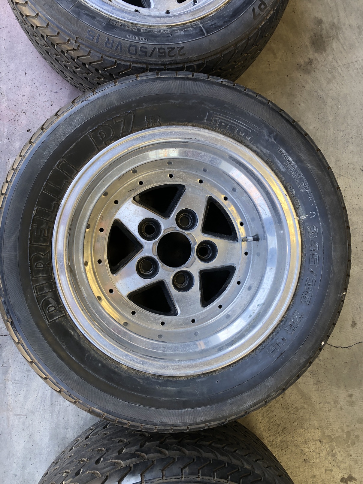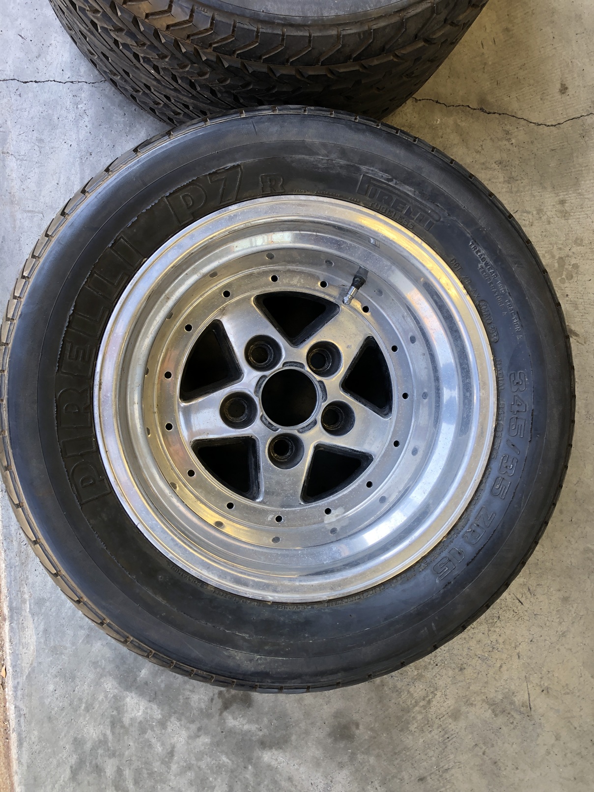 These are Gotti replicas. 8" x 15" with 225/50s and 10" X 15" with 345/35 Pirelli Cinturato P7s! Of course the tire are beyond aged out and cracked everywhere but so what?!? Imagine what cool coffee tables you could have in your man cave! Or, replace the tires - yes, these sizes are available from Tire Rack - and run them on your wide body 914 or 911. I'm halfway tempted to swap them onto the Group 5 914... (IMG:style_emoticons/default/idea.gif) But no. They have to go! All this for only $500 plus shipping from 94952, though I'd REALLY prefer local pick up. Thanks for looking. Chris Attached thumbnail(s) |