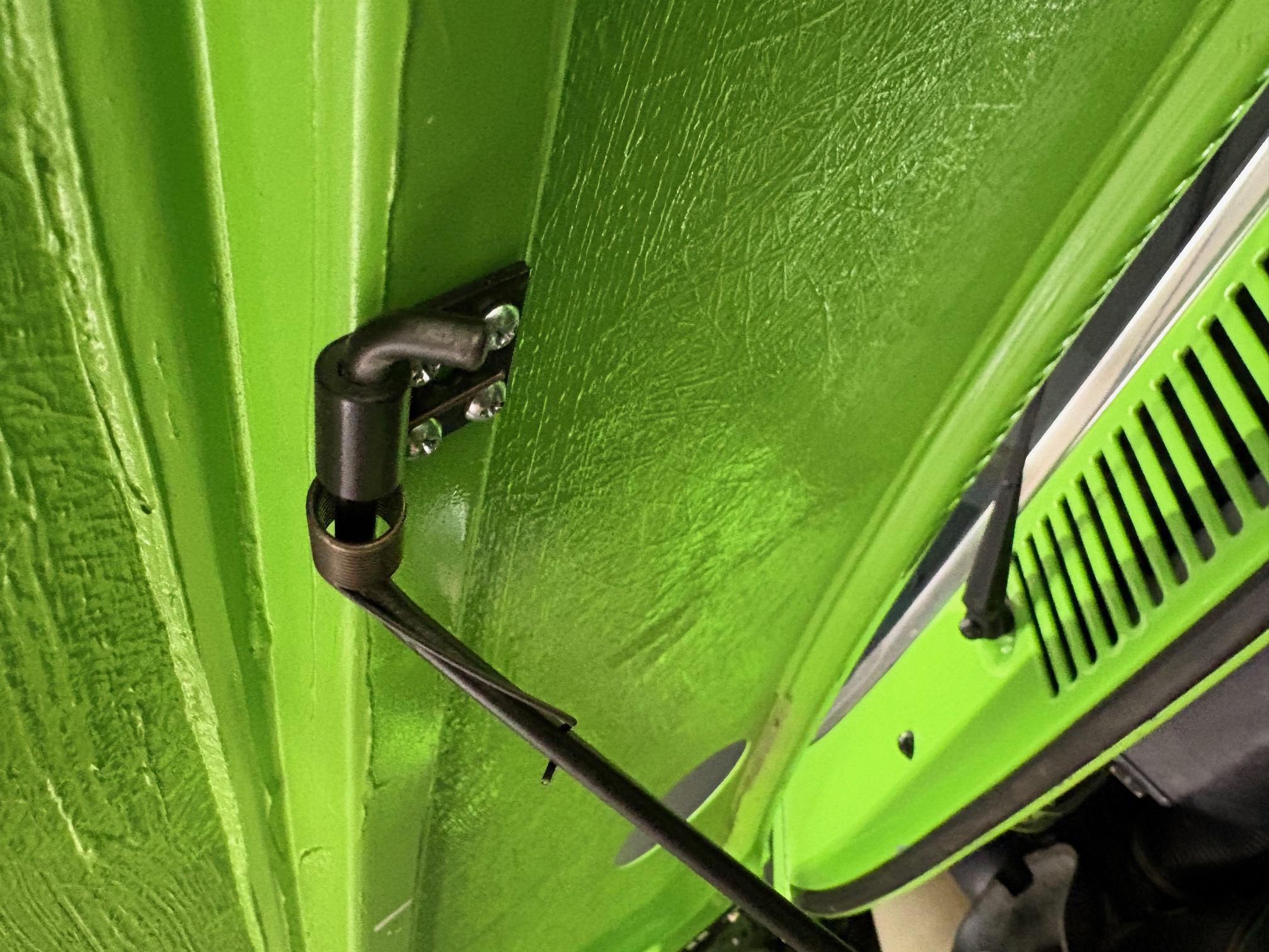 Tom, (IMG:style_emoticons/default/drooley.gif) That is an awesome color! Willow green maybe? We use a single prop (not the GT version) without springs on the fiberglass hood on our 914 that clips into a holder. That is an option, but otherwise probably just give the spring another turn? The color is Lizard Green. |