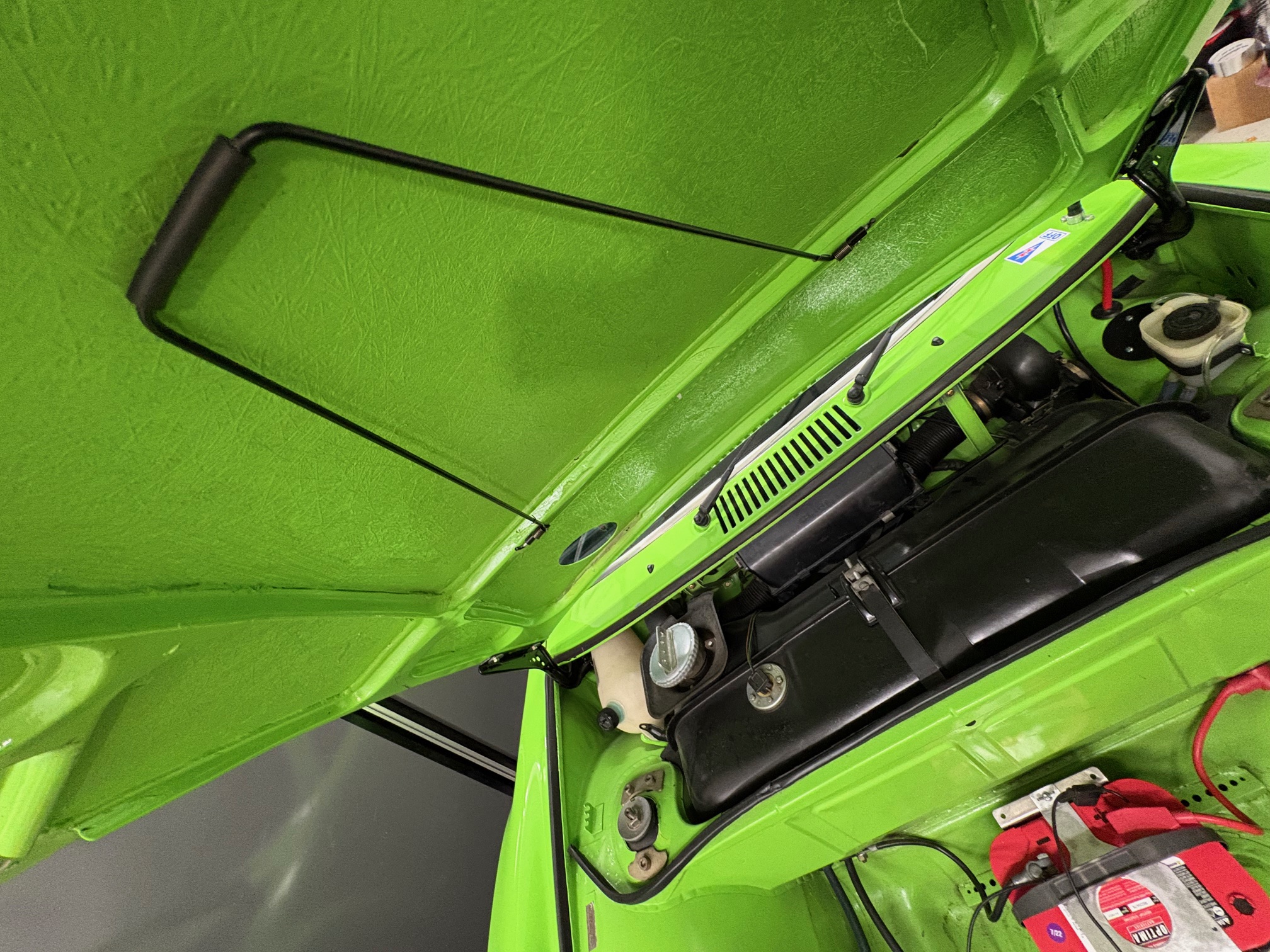 (IMG:style_emoticons/default/drooley.gif) That is an awesome color! Willow green maybe? We use a single prop (not the GT version) without springs on the fiberglass hood on our 914 that clips into a holder. That is an option, but otherwise probably just give the spring another turn? |