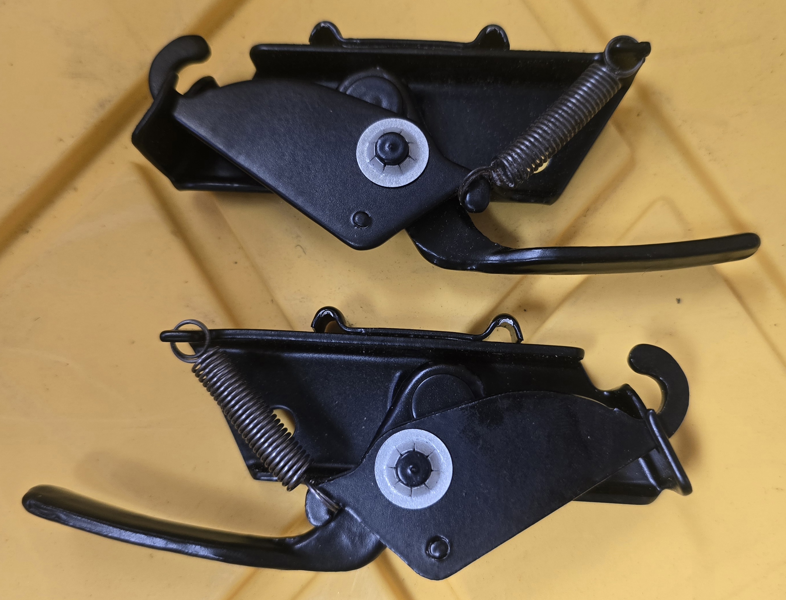 They have been powder coated and have new hooks and springs installed. I have a batch of 6 pairs of late latched that should be ready in about one week. It is important to use the correct type of rear latch. The distance between the humps on the top of the latches is different as is the mounting height. If you re in doubt as to which you have test with a nickle or a quarter. A quarter fits between the humps of the early latches and a nickle fits on the late latches. $90 per pair shipped. $20 core credit for returned cores. Okay if hooks are missing or broken as i usually do not use them because of wear. Attached thumbnail(s) |
