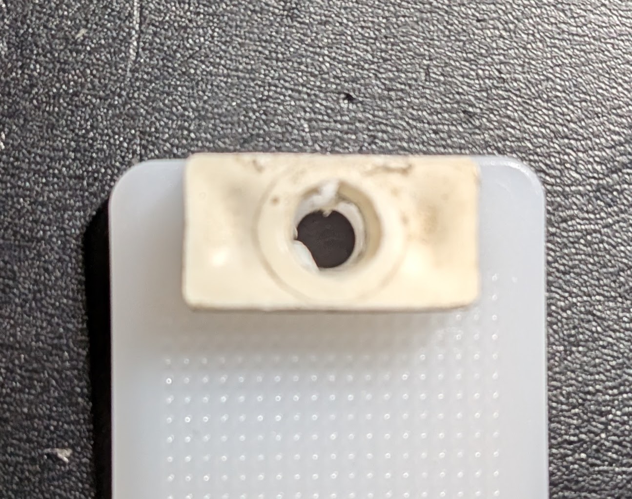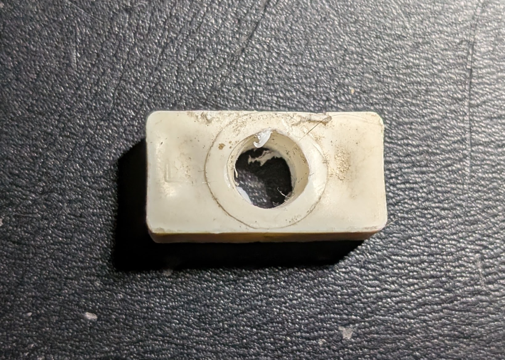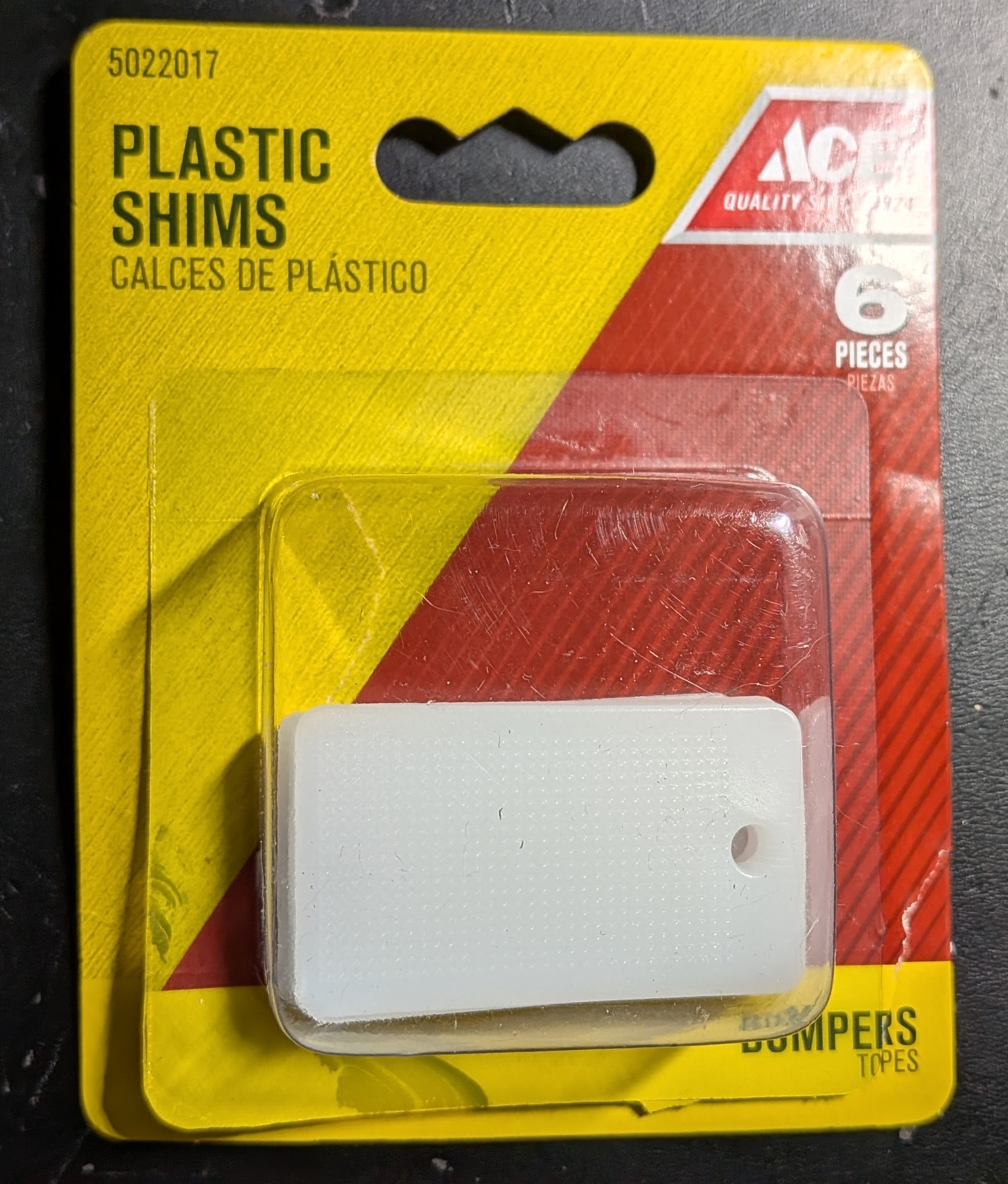 Stripped plastic block. I drilled it to let it slide on the adjusting screw when I used the M5 nuts. Went Ace Hardware today and bought these plastic shims, $3. The hole is exactly the correct size for the adjustment screw to thread into snugly, without tapping it. Thickness is perfect, too. It just takes one cut with a coping saw to make a new adjuster, you don't need to trim the sides. It was a 10 minute fix, if yours is stripped, give it a try. |