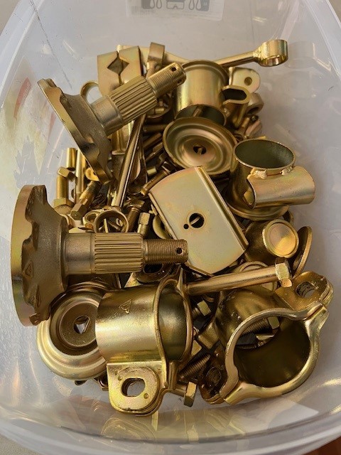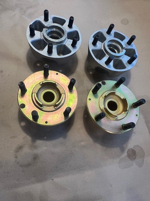 Click to view attachment The rear hubs I had plated some time ago. This weekend I Alodined the front hubs in the hope it's provide some small amount of corrosion protection. I suspect it won't do much, but I already had the chems to do carburetor bodies... Then I pressed all the studs back in.