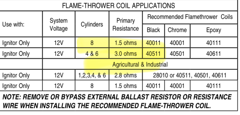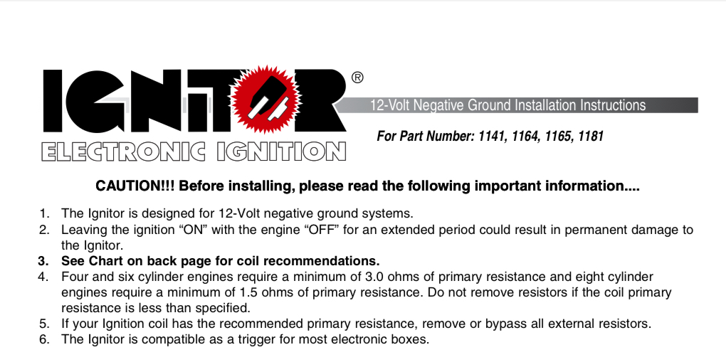Using a coil with too low of primary resistance will burn points or will destroy an electronic ignition.